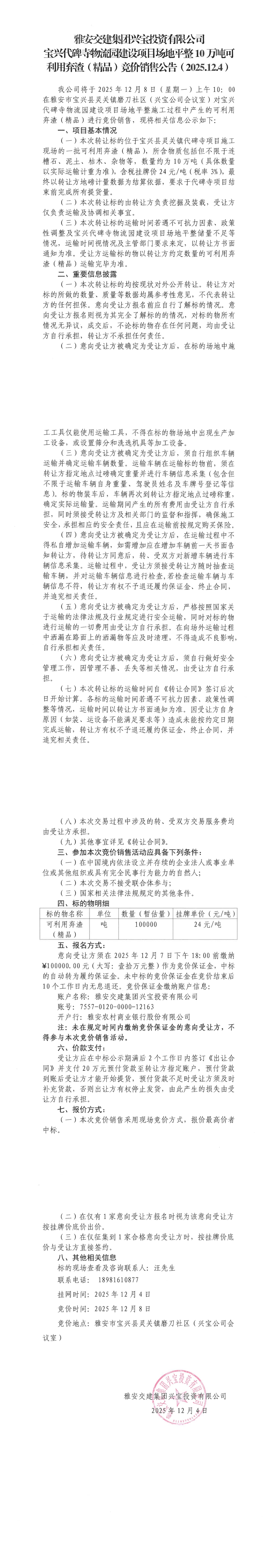 雅安交建集團興寶投資有限公司10萬噸可利用棄渣(精品)競價銷售掛網(wǎng)公告(2025.12.04)