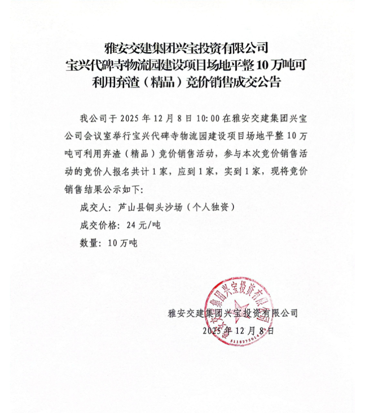 雅安交建集團興寶投資有限公司10萬噸可利用棄渣(精品)競價銷售掛網公告(2025.12.04)