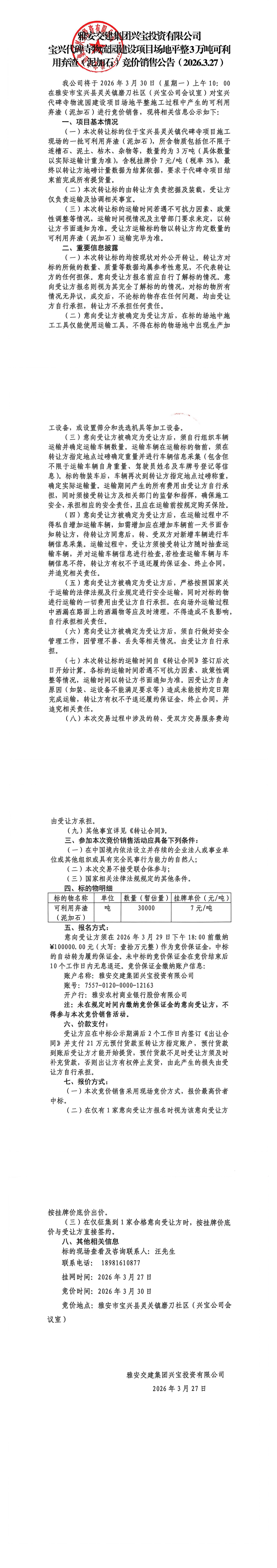 雅安交建集團(tuán)興寶投資有限公司3萬(wàn)噸泥加石競(jìng)價(jià)銷售掛網(wǎng)公告(2026.3.27)